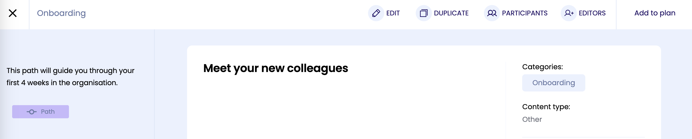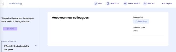 Als Admin kun je de leerpaden uit de bibliotheek toewijzen aan iedereen binnen de organisatie. Open hiervoor het leerpad en klik op 'Deelnemers' rechtsboven.