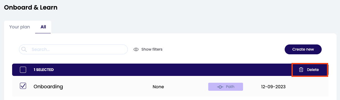 Selecteer het leerpad die je wilt verwijderen door op het vakje links voor de naam van het leerpad te klikken. Je kunt ervoor kiezen om meerdere leerpaden en activiteiten te selecteren.