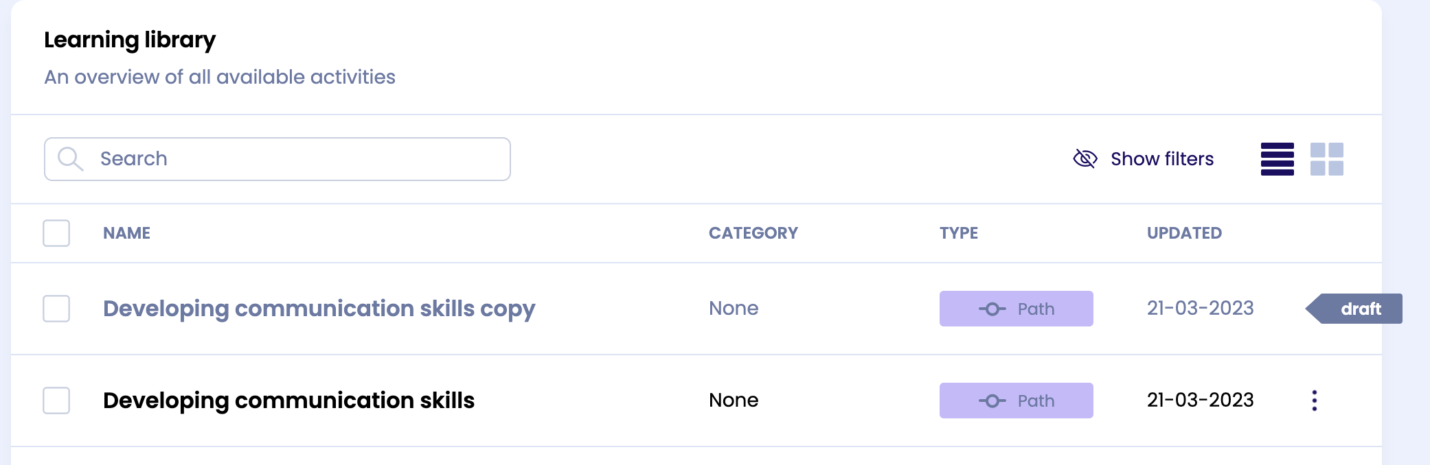 Gebruik het dupliceren bijvoorbeeld als je meerdere soortgelijke leerpaden wilt toevoegen aan de bibliotheek en pas het kopie aan. Wanneer je een leerpad dupliceert, zal de kopie altijd als concept in de bibliotheek verschijnen: