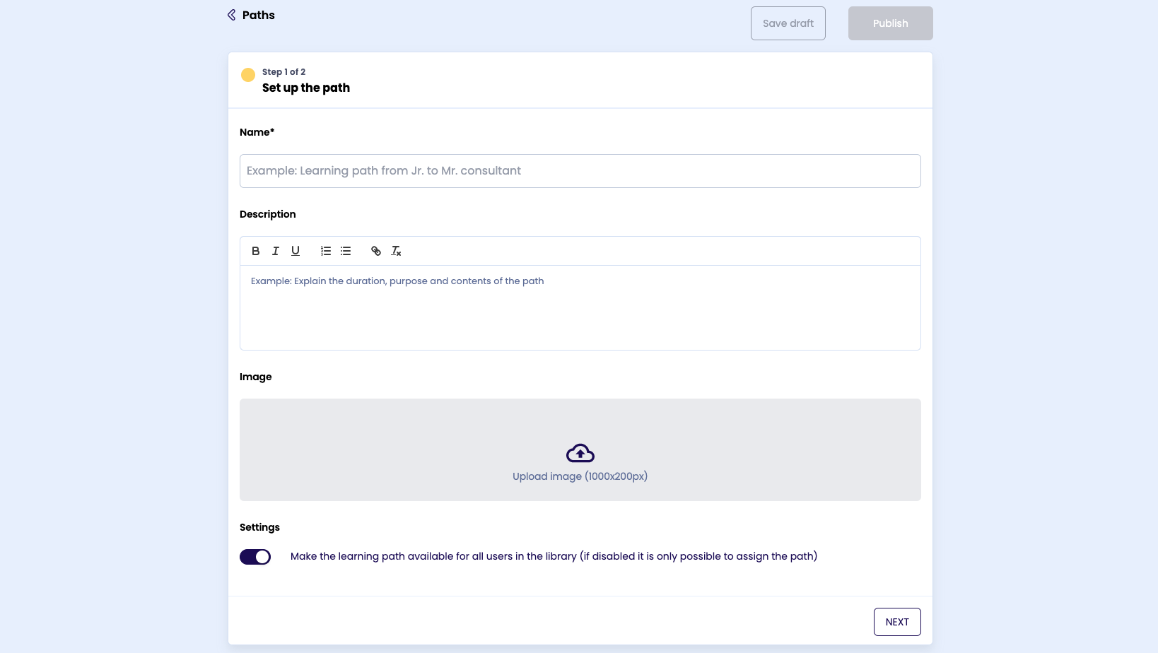 Begin met een passende naam, omschrijving en een afbeelding. Kies ervoor of je het leerpad beschikbaar wilt maken voor de hele organisatie, of dat je het leerpad alleen aan specifieke gebruikers kunt toewijzen.