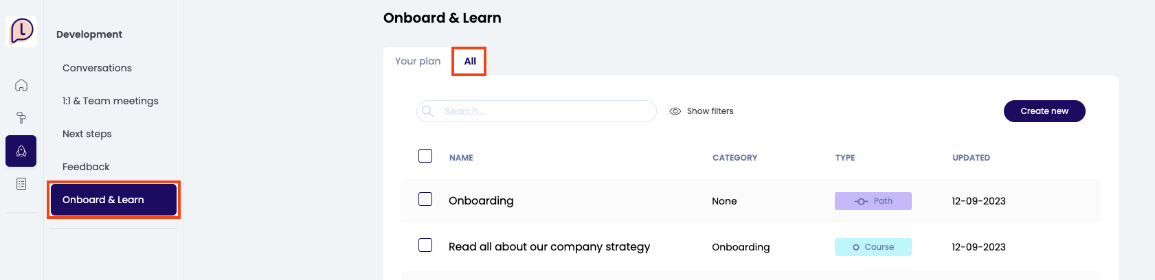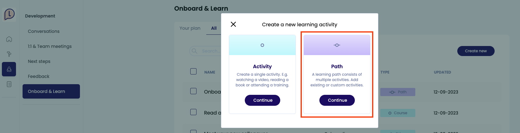 Wanneer je een leerpad wilt maken, ga je naar 'Onboard & Learn' in de menubalk. Je opent jouw eigen ontwikkelplan. In dit overzicht zie je welke activiteiten en leerpaden al aan jouw ontwikkelplan zijn toegevoegd. Ga naar de tab 'Alle' en klik op 'Nieuwe aanmaken' rechtsboven. Kies vervolgens voor Leerpad.