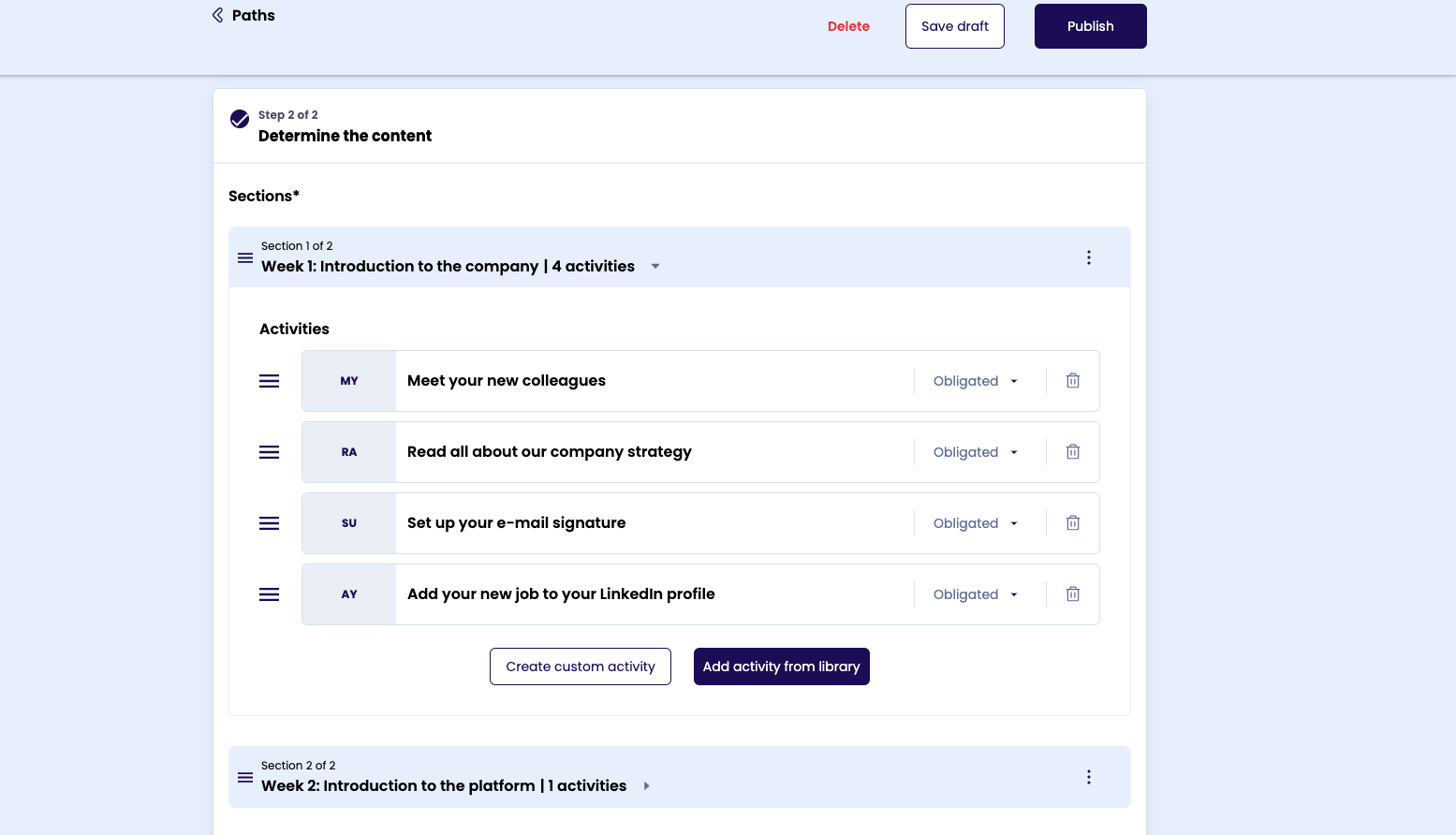 Je kunt 1 of meerdere secties aanmaken. Per sectie kun je leermiddelen uit de bibliotheek toevoegen. Daarnaast heb je de mogelijkheid om een custom activiteit te maken. Let op: Custom activiteiten zijn alleen zichtbaar in het leerpad en komen niet terug in de bibliotheek. Je kunt de volgorde van de leermiddelen in de sectie aanpassen, maar ook gehele secties met drag & drop verplaatsen. Daarnaast kun je per activiteit aangeven op deze verplicht is om af te ronden. Indien verplicht kunnen deelnemers niet naar de volgende sectie als deze activiteit nog niet is afgerond.