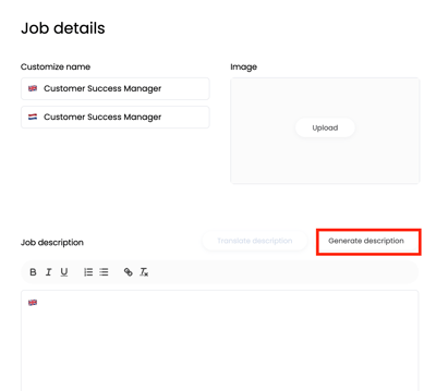 Wanneer je kiest voor de optie om een functie handmatig aan te maken, bijvoorbeeld als je een bestaand eigen functieprofiel aan Learned wilt toevoegen. Zie de als nog opties om een beschrijving te genereren. Klik hiervoor op 'Genereer beschrijving':