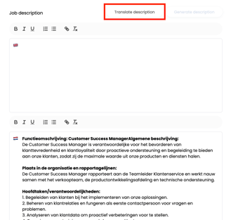 Wanneer er een beschrijving aan het functieprofiel is toegevoegd, en er meerdere talen geslecteerd staat om het profiel in aan te maken, zie je de mogelijkheid om de beschrijving te vertalen. Klik hiervoor op 'Vertaal beschrijving':