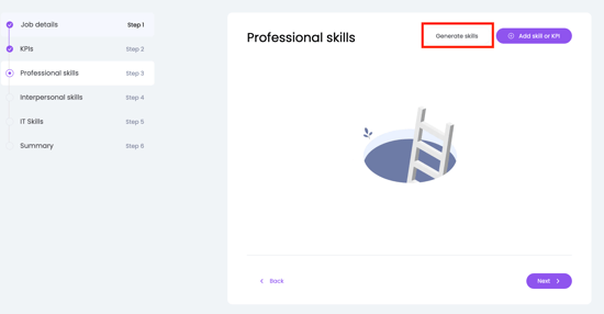 Dezelfde optie als voor het genereren van een functiebeschrijving zie je ook terugkomen in stap 2 t/m 5 van het aanmaken van een functieprofiel. Je kunt Luca namelijk ook skills of KPI's laten genereren voor een functie. Klik hiervoor op 'Genereer skills':