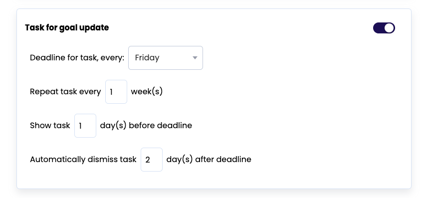 • Deadline voor de taak: Op welke dag in de week moet de Doelen Update zijn afgerond?