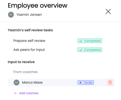 Op de overzichtspagina klik je op de medewerker waar de coach aan toegevoegd moet worden. Wanneer je met jouw muis over de coach heen beweegt, ontstaat er een prullenbakje, verwijder de betreffende coach door op het prullenbakje te klikken.