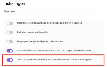 Wanneer je als Admin of coach een evaluatie(cyclus) aanmaakt. Kan je bij stap 3 de instellingen bepalen voor alle deelnemende medewerkers.
