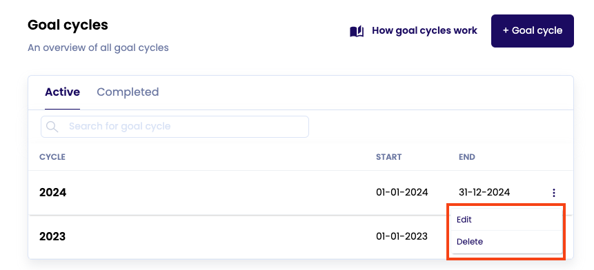 Learned heeft enkele standaard doelen cycli in het systeem gezet zodat je hier direct mee aan de slag kunt. Indien jouw organisatie met doelen werkt in een ander termijn dan bijvoorbeeld een jaar of kwartaal, is het mogelijk om de standaard doelen cycli te bewerken via de 3 bolletjes achter de cyclus.