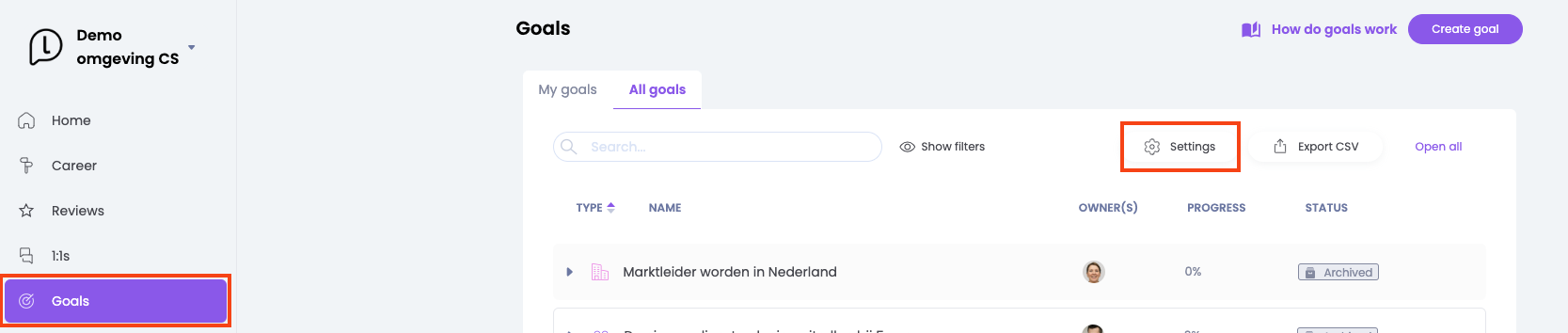 De Admins van organisatie zijn verantwoordelijk voor het aanmaken en bijhouden van de doelen cycli. Een doelen cyclus is een termijn waaraan het mogelijk is om doelen te koppelen. Met andere woorden: binnen dat specifieke termijn wordt er aan het doel gewerkt. Om de doelen cycli in te richten ga je naar de pagina Doelen. Klik vervolgens op Instellingen om de cycli te bekijken en aan te maken.