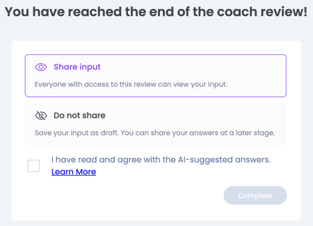Wanneer je gebruik maakt van AI gesuggereerde antwoorden, zul je aan het einde van de evaluatie aanvinken dat je de suggesties hebt gelezen en dat je er akkoord mee bent.