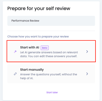 Wanneer jullie organisatie de AI instellingen hebben geactiveerd om de evaluaties voor te kunnen bereiden met behulp van AI, krijg je op het moment dat je jouw voorbereiding wilt starten de keuze: