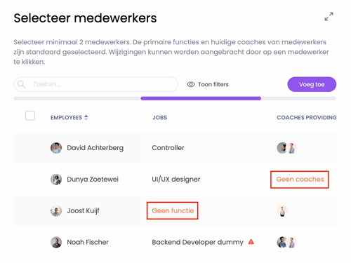 • Oplossing: Wijs de betreffende medewerker toe aan het juiste team binnen het systeem, waarbij de bijbehorende coach is ingesteld. Dit kun je doorgaans doen in de stappen van het aanmaken van de evaluatiecyclus.